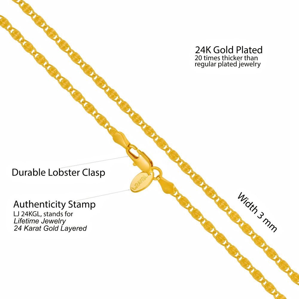 Our 3mm 24k Gold Plated Scroll Chain Necklace for Women and Teens is made with 20X more gold than standard electroplate. It is made to last! People love this as it has the look and feel of solid gold but costs so little. We offer a Selecthey Replacement Guarantee in case of damage or wear. Comes in a perfect gift pouch.