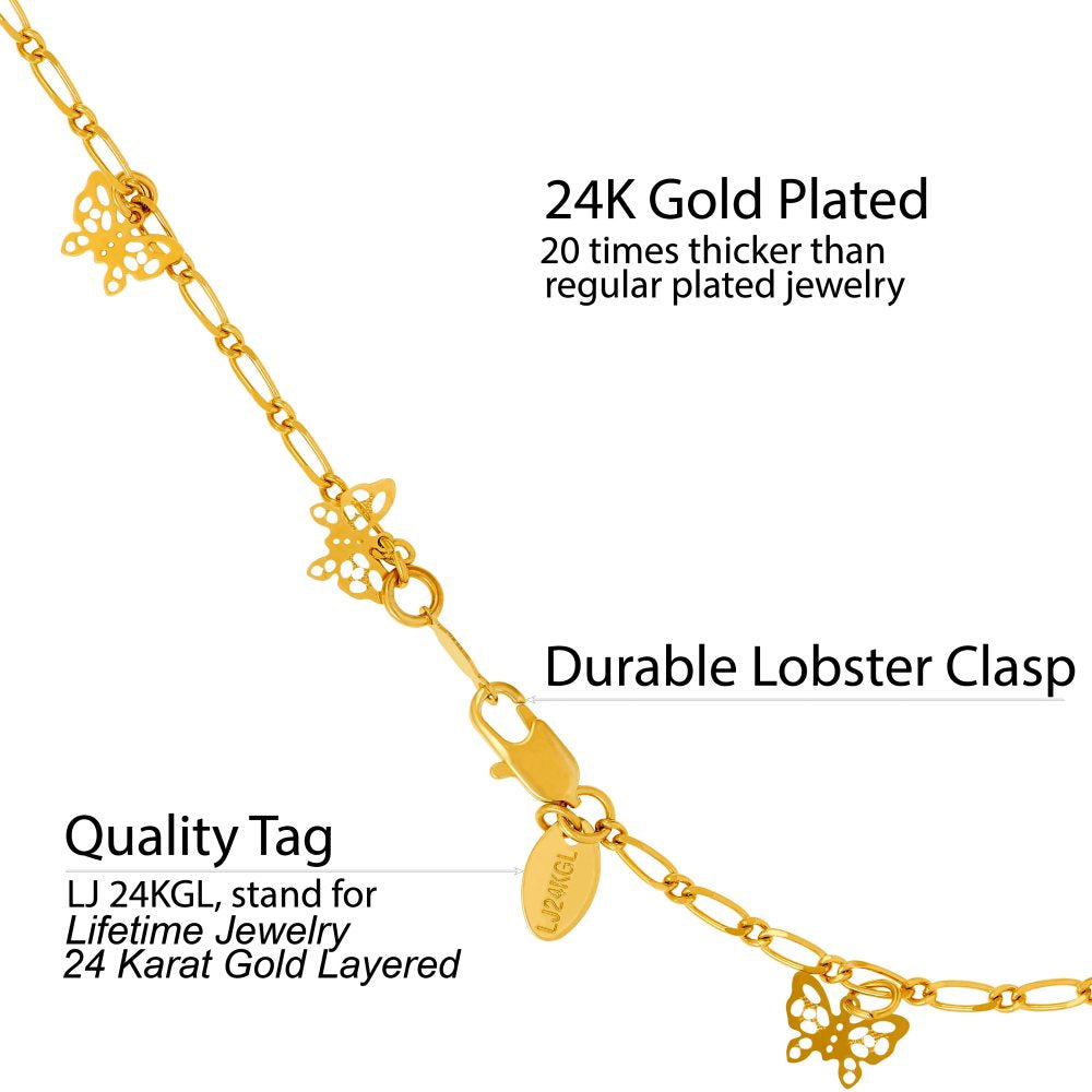 This beautiful 24k gold plated Butterfly Anklet is made for women, girls and teens. Wear it to a party, dance, beach, or any social occasion. Perfect for holidays. Made to last a lifetime, it has 20X more gold than standard plate. Should it get damaged or worn, take advantage of our Selecthey Replacement Guarantee. Comes in 9”, 10” and 11”.